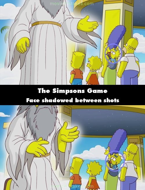 Continuity mistake: Game Over: Whilst God is explaining the Planet Earth game to the Simpsons, Maggie's face has light cast on it. But later in the cutscene, after the flashback of God losing the manual, Maggie's face is suddenly shadowed.