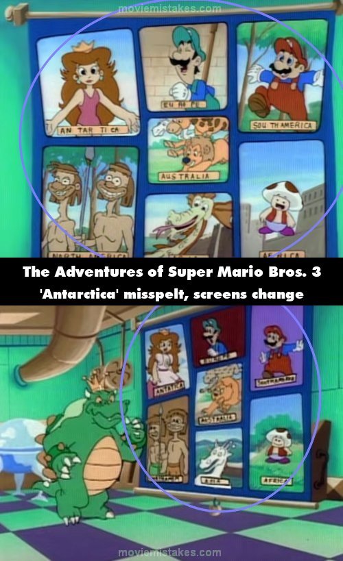 Character mistake: When King Koopa notices the Koopalings running to him, the screen with Antarctica has its title misspelt as "Antartica." Also, the dragon that appears on the screen for Asia goes from green-yellow to white and blue.