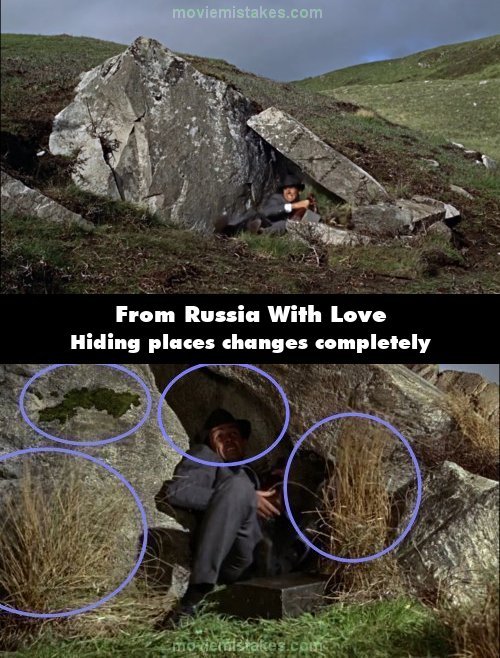 Continuity mistake: When Bond hides from the helicopter under a crack in the rocks, the rocks, the crack and the bushes around are totally different in the close-up. Plus a bunch of moss suddenly appears.