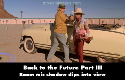 Visible crew/equipment: At the drive in theater, Marty says he'll put the boots on when he gets there. The camera pans to the left to follow Marty and Doc as they continue to talk. On the very far left side of the screen, the shadow of the boom mic briefly dips into frame. This happens just before Doc walks over to the DeLorean from his car. (00:16:35)
