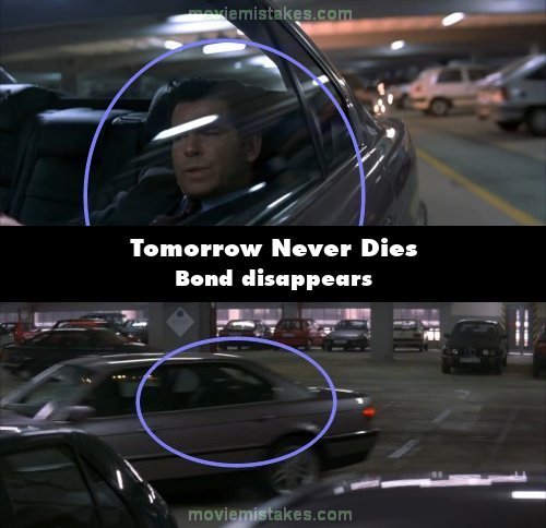 Continuity mistake: At the car park, Bond disappears in all the wide shots of the car but reappears in the close-ups. This was due because the stunt driver was seated in the back seat.