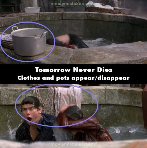 Continuity mistake: When Bond and Wai dive into the fountain to hide from the helicopter, clothes and pots appear/disappear randomly between shots.