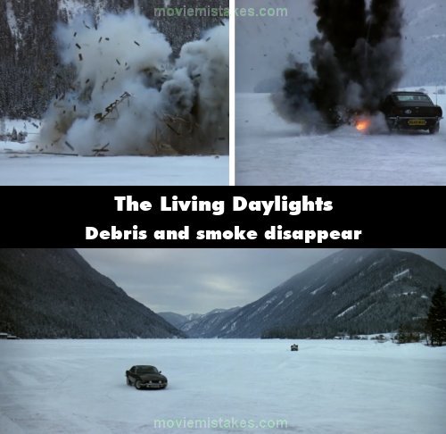 Continuity mistake: On the frozen lake, a cottage is blown to pieces, a wheel flies away, and many explosions take place, rising big clouds of black smoke. However, in the wide angle, the place is spotless.
