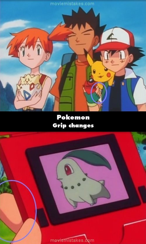 Continuity mistake: When Ash uses his Pokédex to find facts on Chikorita, the end of his right index finger is on its left side, but in the next shot, it is not. (00:02:01)
