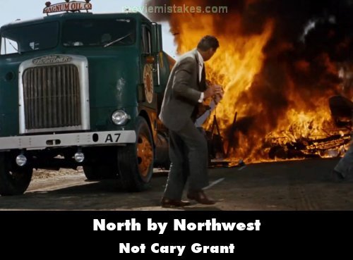 Visible crew/equipment: When the crop duster and the truck are about to explode and the truck drivers run away, one can tell it's not Cary Grant watching the havoc but his stunt double because of his rounder face and slightly different hairstyle. Also confirmed by actress Eve Saint-Marie.