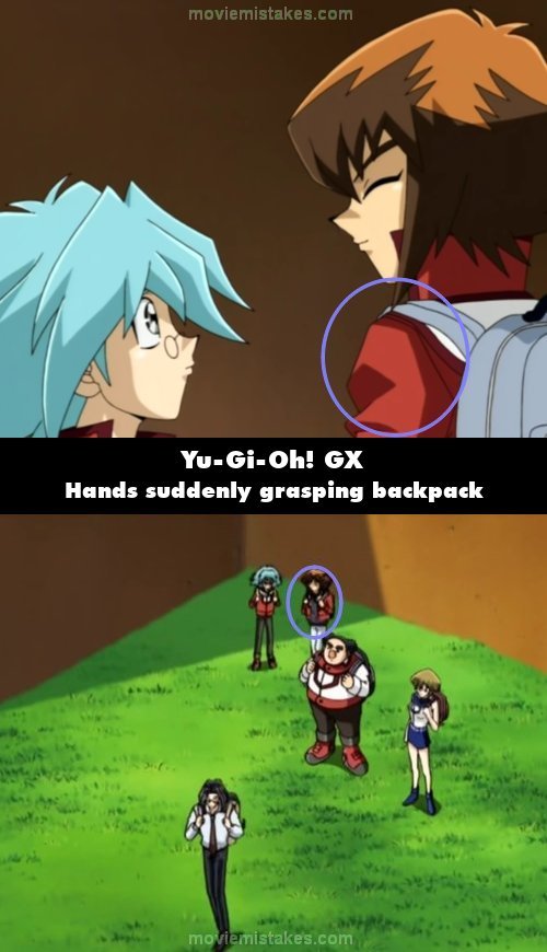 Continuity mistake: After Syrus explains to Jaden the call he overheard Professor Banner having, Jaden tells him "This is starting to sound like another chilli sauce nightmare" and has his hands at his side. In the next shot, Jaden's hands are suddenly grasping his backpack. (00:03:58)