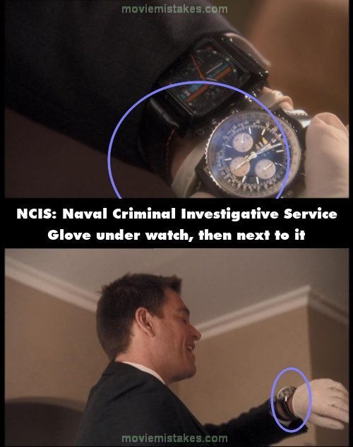 Continuity mistake: When DiNozzo has got the victims watch on, it's on over his white glove. When the shot changes it's now over his bare skin and not the glove. (00:10:20)