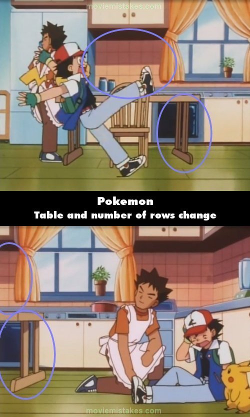 Continuity mistake: When Brock is next to Ash at a cabinet, the right support of the table goes from being a darker brown than the top of it with it being not past the oven to being the same brown with it past it. Also, the number of rows of tiles before the window goes from four to five. (00:02:39)