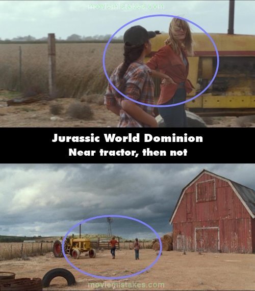 Continuity mistake: When Ellie is talking to the farm owner, her position in relation to the tractor changes from the closeup to the long shot. She ends up further away. (00:19:10)