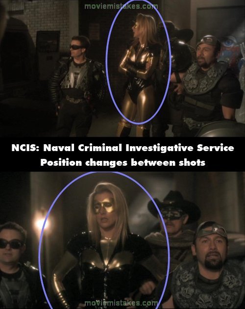 Continuity mistake: Dinozzo makes a comment about the superhero's outfit. At which point her entire demeanour changes between shots. (00:25:00)