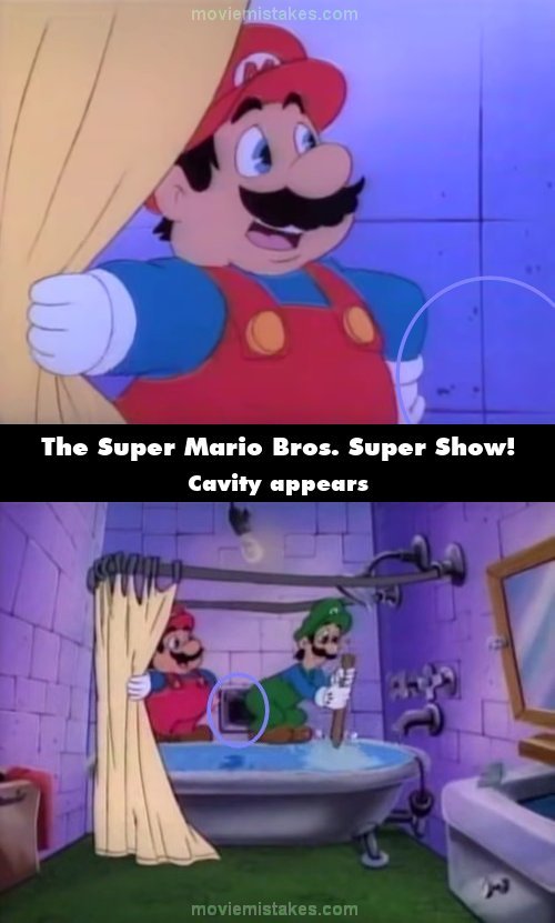 Continuity mistake: When Mario moves a curtain in the animated intro, there is no cavity in the shower, but in the next shot, one appears. (00:03:35)