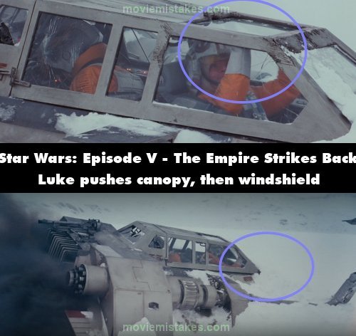 Continuity mistake: When Luke crashes on the snow he tries to open the cockpit pushing the canopy. A shot later he is pushing the windshield. This changes back and forth several times.