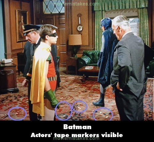 Visible crew/equipment: After the opening credits, during the scene in Commissioner Gordon's office Gordon tells Chief O'Hara to assign an extra squad, and numerous white tape marks are visible on the rug as the actors walk around. (00:06:15)