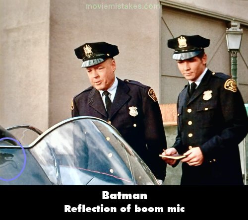 Visible crew/equipment: Outside the run down factory, when the GC police officers step out of their patrol car and walk over to the Batmobile, just as senior Officer Dietrich begins giving the rookie officer the what for, the reflection of the boom mic is visible on the Batmobile's left bubble windshield, at the left side of the screen. (00:10:50)