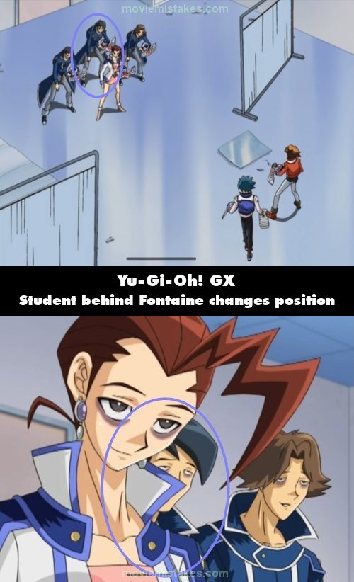 Continuity mistake: When Jaden accepts Miss Fontaine's duel, there is a shot where Fontaine says "Prepare to join us. You too, Jesse", and three Obelisk Blue students are behind her. There is one directly behind her, one to her left, and one to her right. When the shot cuts, two of the students are on her left. (00:09:12)