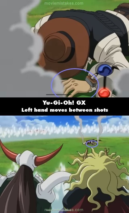 Continuity mistake: After Syrus and Ojama Yellow keep walking toward the Supreme King's castle, the scene cuts back to Jim lying on the ground, while the King's goons laugh at him. Jim's left hand is next to his head in the first shot, but then it is further away when the shot cuts. (00:09:10)