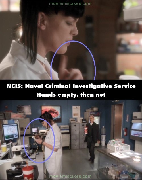 Continuity mistake: When Gibbs walks in to see Abby telling the carbon monoxide alarm off, she has her right hand raised in one shot and holding the alarm in the next. (00:23:00)