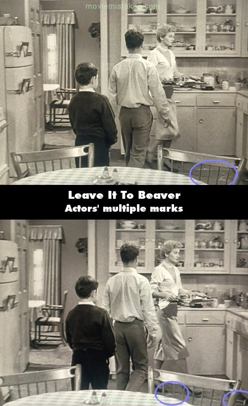 Visible crew/equipment: After Ward has a word with the boys about having consideration for another person's happiness, when Wally and Beaver enter the kitchen, we can see chalk marks and T-marks on the floor near the counters. (00:22:10)