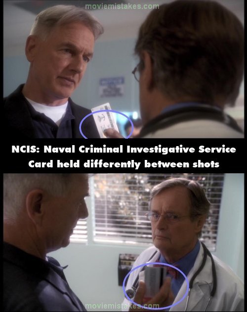 Continuity mistake: The way Gibbs holds the key card that Ducky gives him changes between shots. Watch the sides of the card. (00:09:30)