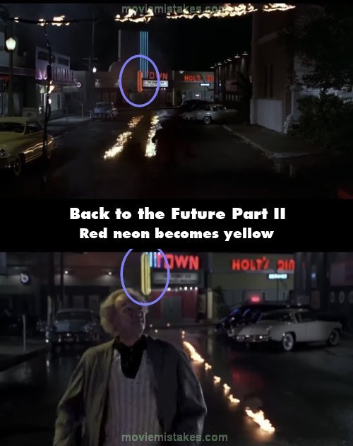Continuity mistake: At the end of the movie, when Doc is running down the street after the DeLorean has gone back to 1985, the neon changes from red to yellow. It was red in both 1955 and 1985 in the first film. (01:41:34)