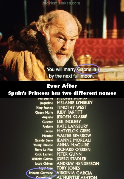 Other mistake: When Queen Marie tells Henry he was born to privilege and it comes with specific obligations, Henry says, "But marriage to a complete stranger never made anyone in this room very happy." Then, King Francis demands, "You will marry Gabriella by the next full moon." The problem is Princess Gabriella of Spain is named Princess Gertrude in the credits. (00:34:05 - 01:57:15)