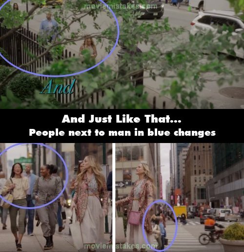 Continuity mistake: When the episode starts, there's a man with a blue jacket behind Carrie, and two women 6 meters behind. A shot later, the man and the girls have swapped positions. Oddly enough, when Carrie talks to Lissette, one of the women vanishes, and the man in the blue jacket is now walking next to and chatting with the remaining woman.