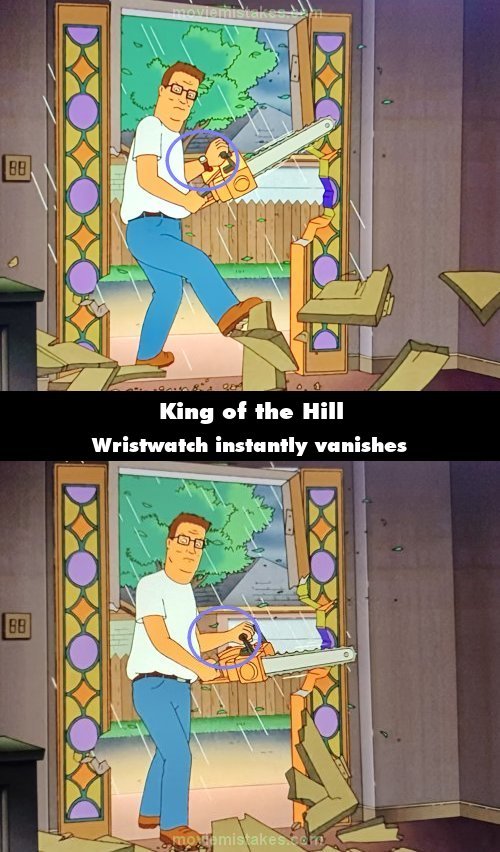 Continuity mistake: While the neighbors are tearing down the McMansion with their tools, when Hank chainsaws the door and kicks it in, Hank's watch suddenly vanishes from his wrist mid-shot.