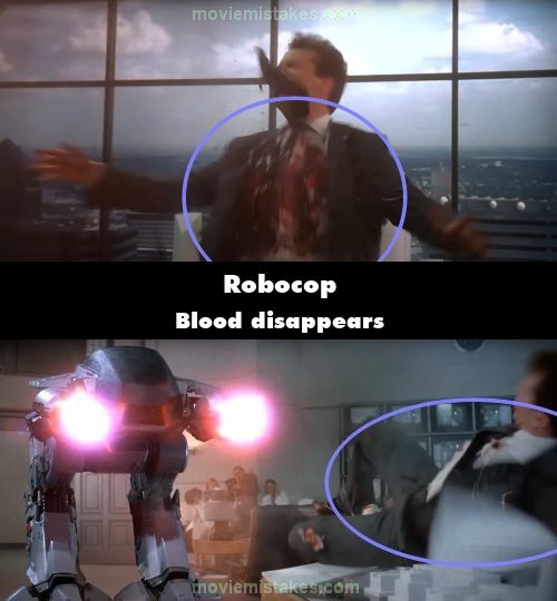 Continuity mistake: When the ED-209 kills the businessman, his chest and tummy are covered in blood. However, when he falls backwards, the shirt is clean except for a small spot with blood.