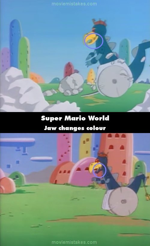 Continuity mistake: When Mario, his friends, and the cave people are ready to fight the Mega Mechanasaur, the machine's lower jaw changes from yellow to blue. (00:10:40)