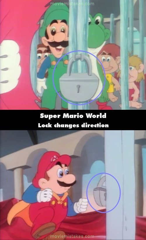 Continuity mistake: When Mario rips the tent, the lock on the cage faces away from it, but in the next shot, it faces towards it. When Luigi, Yoshi, and the cave people cheer for Mario, the lock returns to its original orientation. (00:10:12)