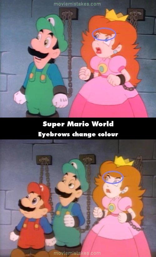Continuity mistake: When Luigi says that he and his friends are trapped, Princess Toadstool's orange eyebrows turn black. (00:05:33)