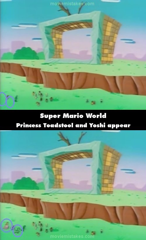 Revealing mistake: When Mario and his friends run over to the giant television, Princess Toadstool and Yoshi can be seen appearing out of thin air. (00:01:32)