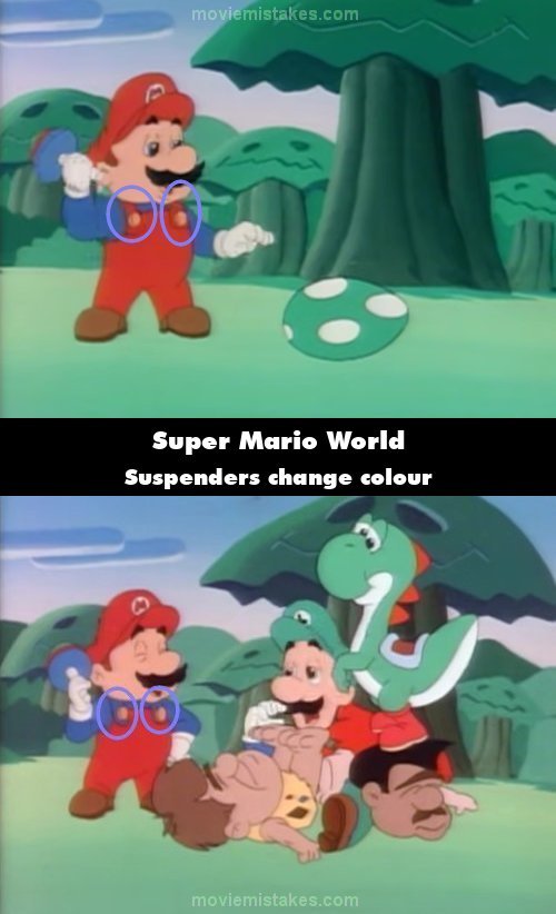 Continuity mistake: When Luigi asks if he caught the ball, Mario's red suspenders turn blue like his shirt, and shortly after, he is not coloured in at the bottom of the screen. (00:10:44)