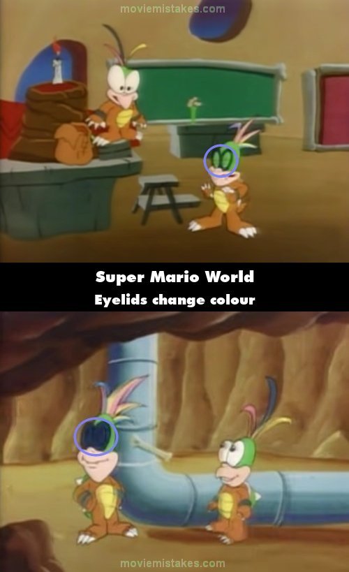 Continuity mistake: When the camera pans to Hip and Hop underground after Mario and his friends walk inside, Hop's green eyelids turn black like his glasses. (00:07:42)