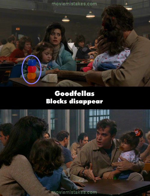 Continuity mistake: When Henry Hill is in jail and talking with his wife, the child is playing with a stack of coloured toy blocks. The order the blocks are stacked in change in different shots. (01:24:15)