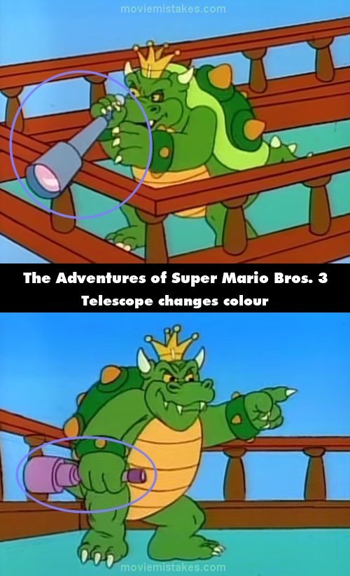 Continuity mistake: When King Koopa takes out his telescope, it is blue, but after he looks through it, it turns pink. (00:02:36)