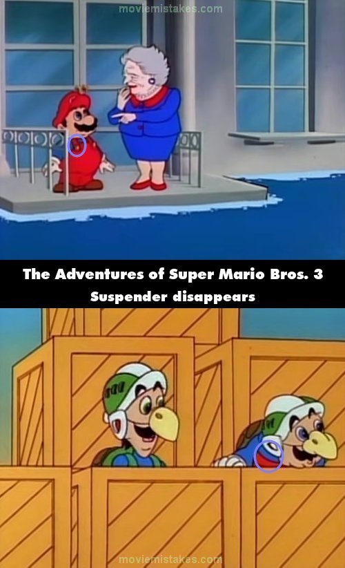 Continuity mistake: When Luigi asks if the disguises will allow him and Mario to board King Koopa's Doomship, one of Mario's suspenders disappears. (00:07:57)