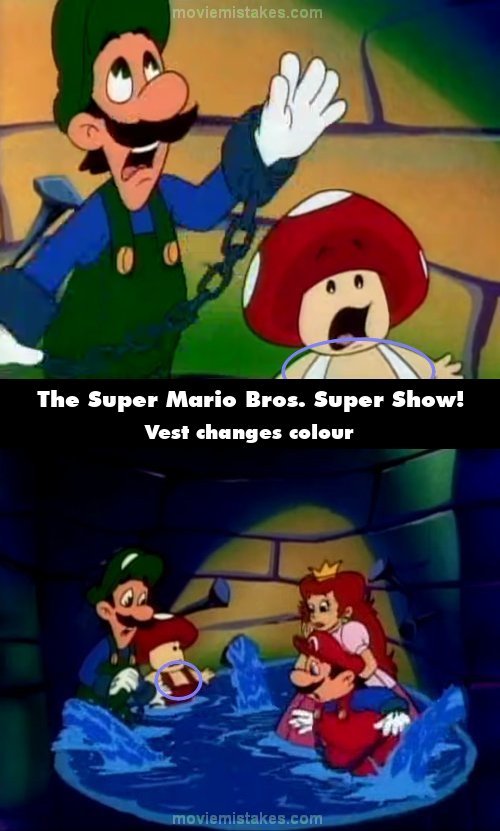Continuity mistake: When the dungeon starts filling up with water, Toad's white vest turns red like his pants. (00:10:38)