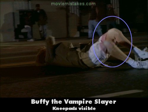 Revealing mistake: When Buffy runs in front of the car you can see knee pads on her knees. You have to look quite closely because they are the same colour as her tights. (00:15:00)
