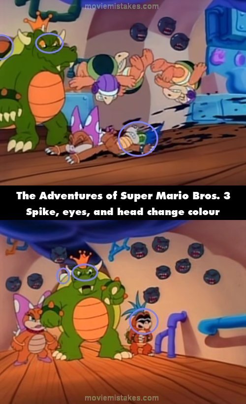 Continuity mistake: When King Koopa orders the Fire Chomps to attack, the orange spikes on his shell and his yellow eyes turn white. In the same shot, Cheatsy's green head turns orange while his green eyelids turn black. (00:09:00)