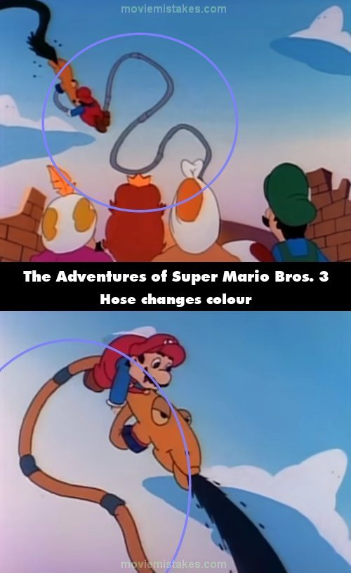 Continuity mistake: While Mario is on the hose, its colour and design changes several times. (00:10:03 - 00:10:49)