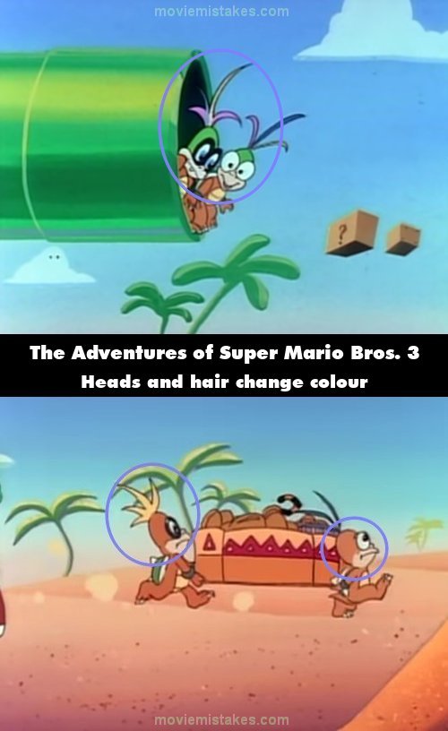 Continuity mistake: When Hip and Hop run past Mario's friends, their green heads turn orange. This also happens when the Paragoombas say that they captured Mario's friends in the tower. (00:03:47 - 00:08:53)