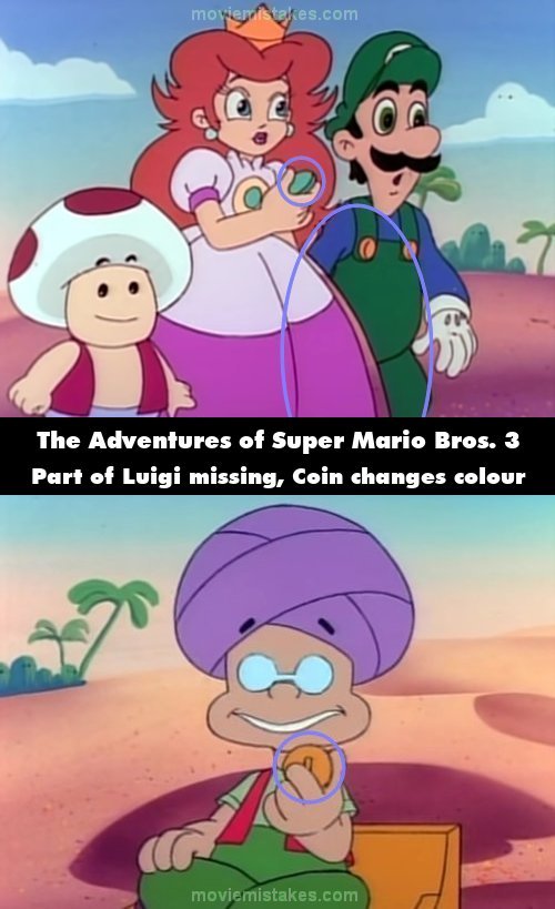 Revealing mistake: When Princess Toadstool says she will take a map to the tomb, part of Luigi is missing. In the same shot, the Coin Princess Toadstool is holding is blue, but in the next shot, it turns yellow. (00:05:56)