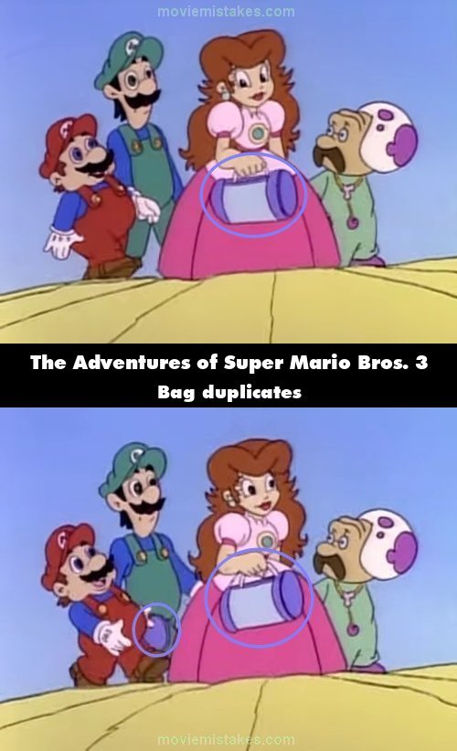 Revealing mistake: After Mario hands Princess Toadstool her bag, it duplicates. (00:00:49)