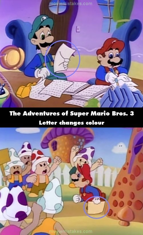 Continuity mistake: When Luigi gives Mario the letter, it is white, but in the next shot, it turns yellow. (00:04:20)