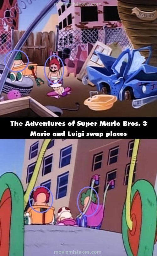 Continuity mistake: When Luigi notices the Koopas, he and Mario swap places. In the same shot, the backs of their bibs disappear. Shortly after, the ground switches from pavement to dirt. (00:04:47)
