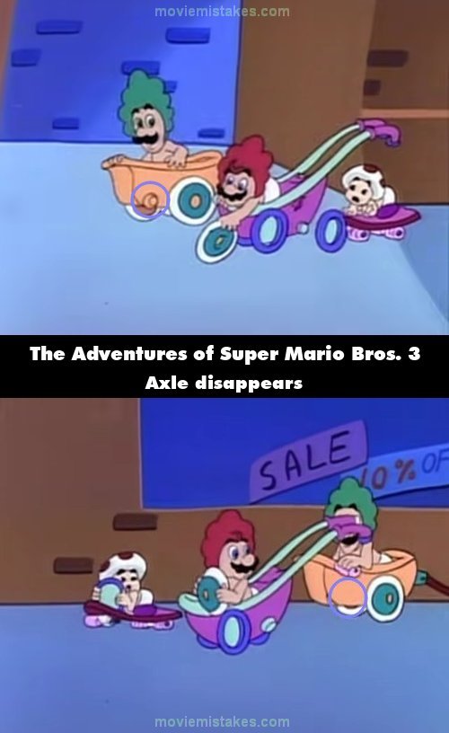 Revealing mistake: When Luigi replaces the wheel, its axle disappears. (00:04:53)