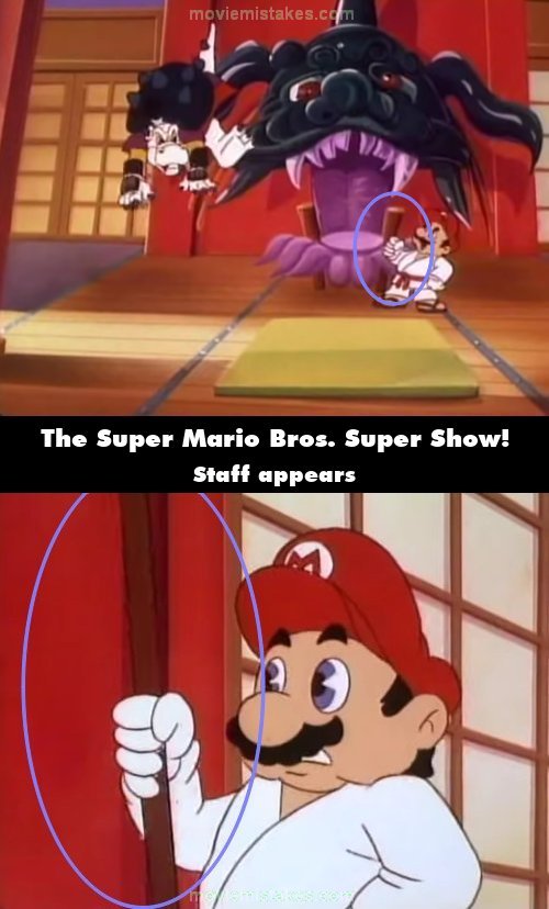 Continuity mistake: When Mario says that Karate Koopa is finished, he is not holding anything, but in the next shot, he has his staff. (00:15:41)