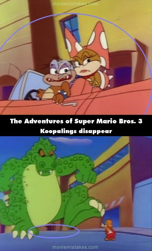 Continuity mistake: When Mario shoots fireballs at Madzilla, the Koopalings and their car disappear. This also happens when Mario says his fire powers are gone. (00:05:34)