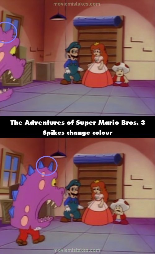 Continuity mistake: When Mario approaches his friends with a head, its pink spikes turn blue. (00:06:54)